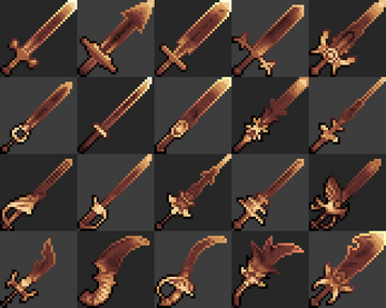 I like what you are doing here, the first sword looks best. I think using simple weapon shapes would give the best results for this style.